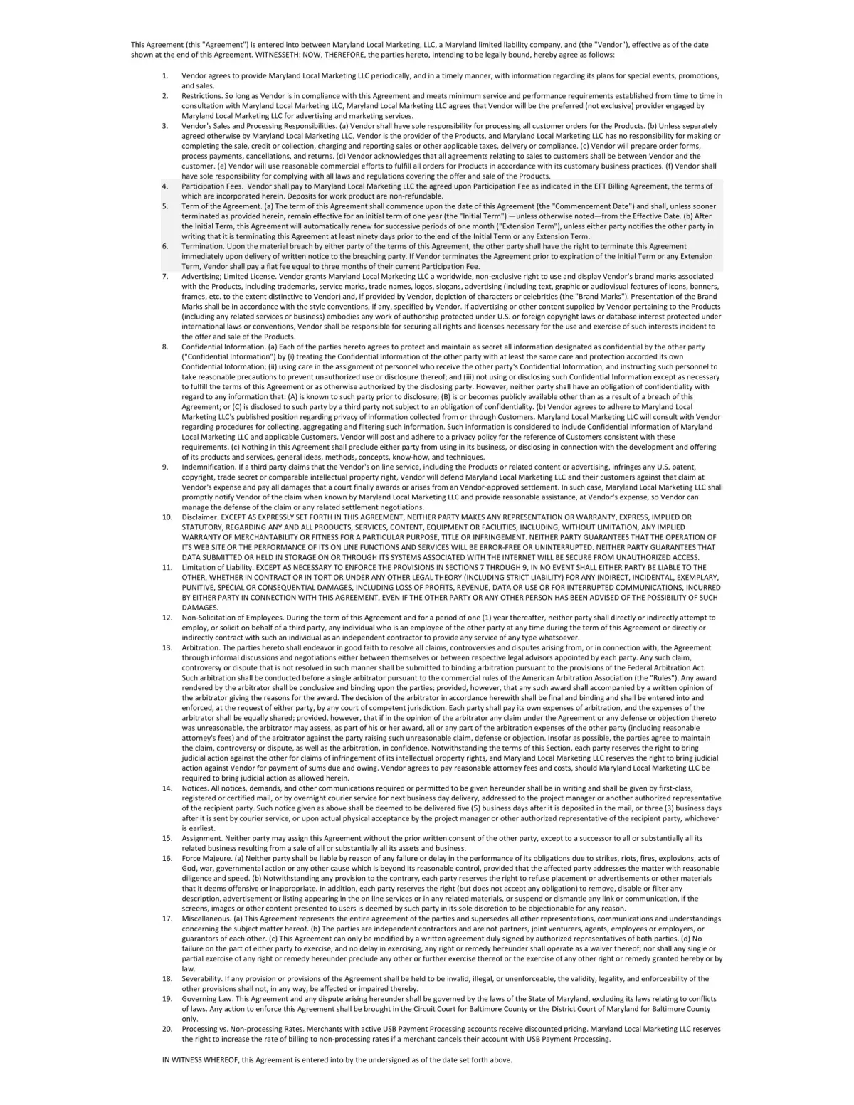 Maryland Local Marketing Agreement